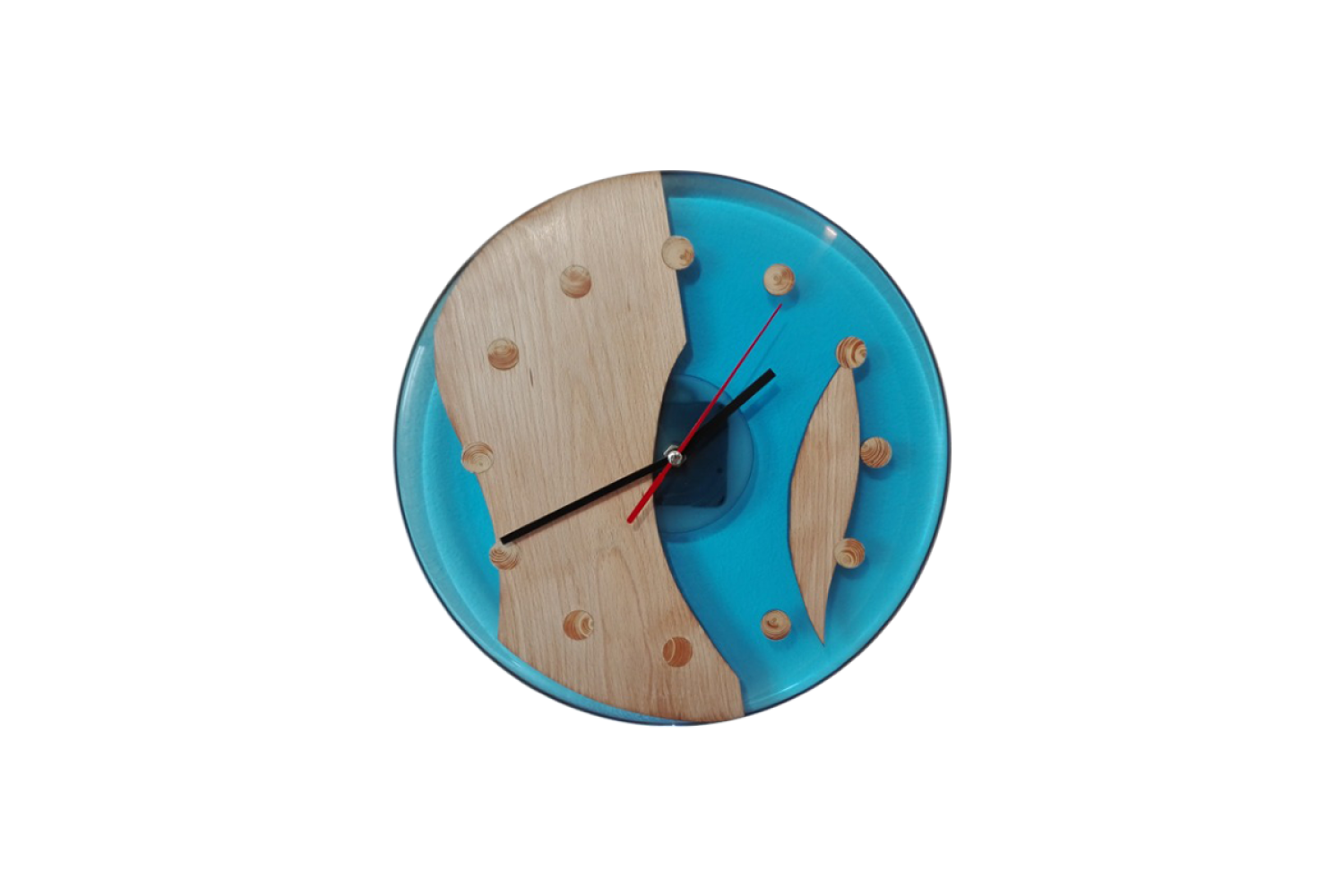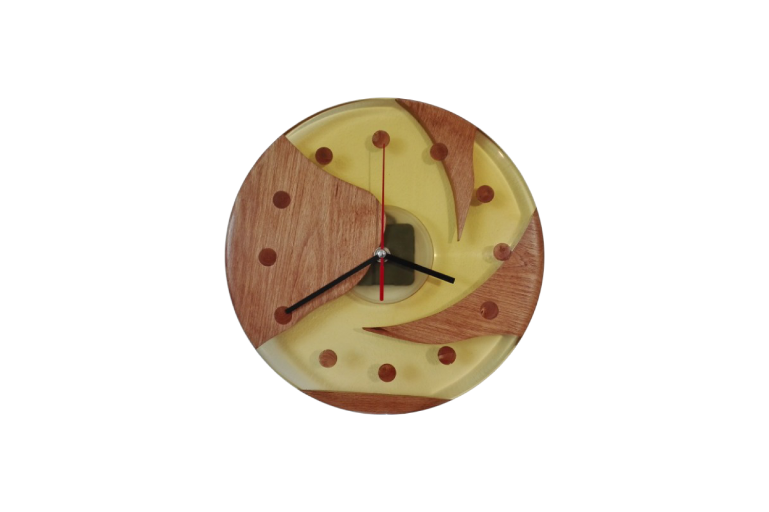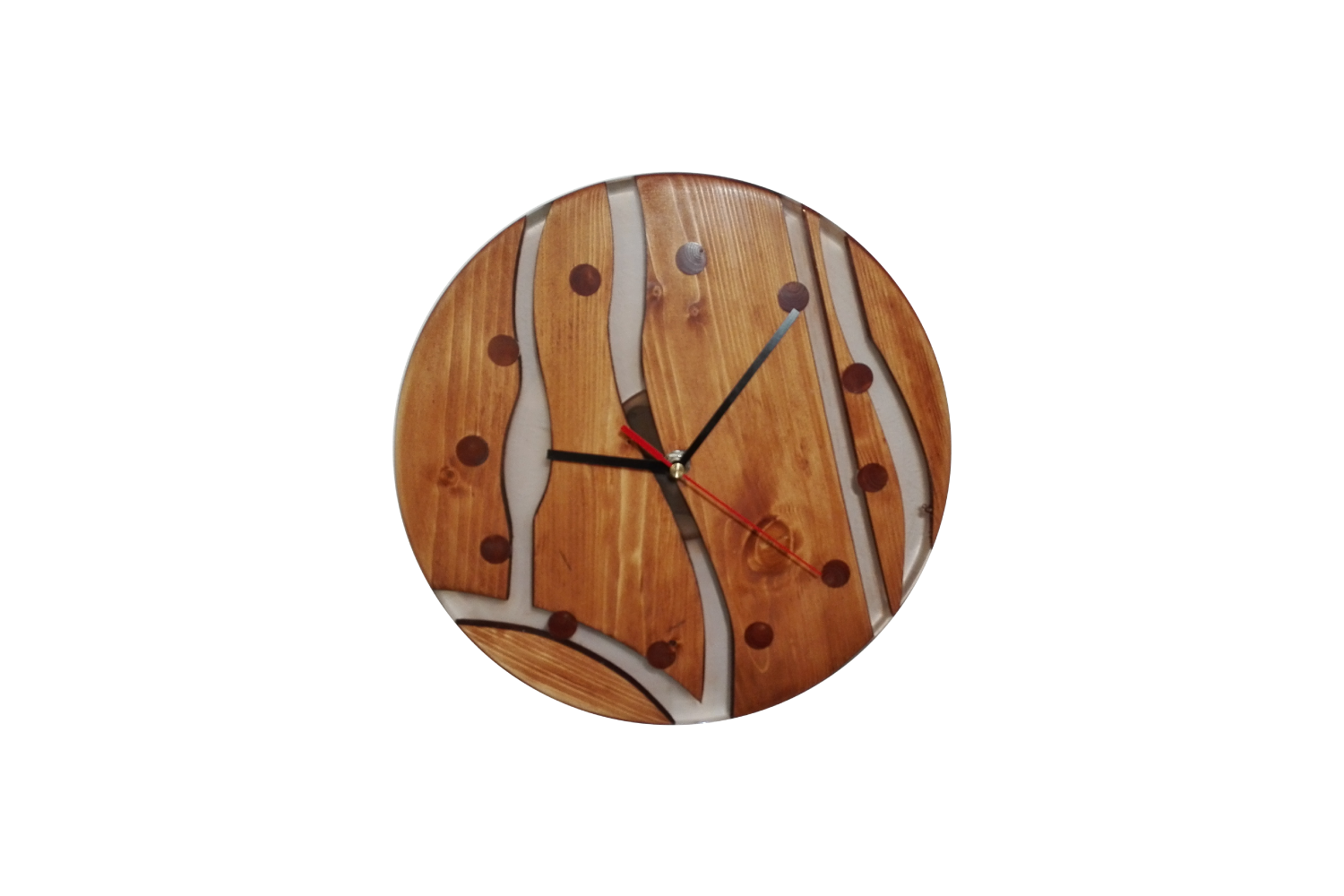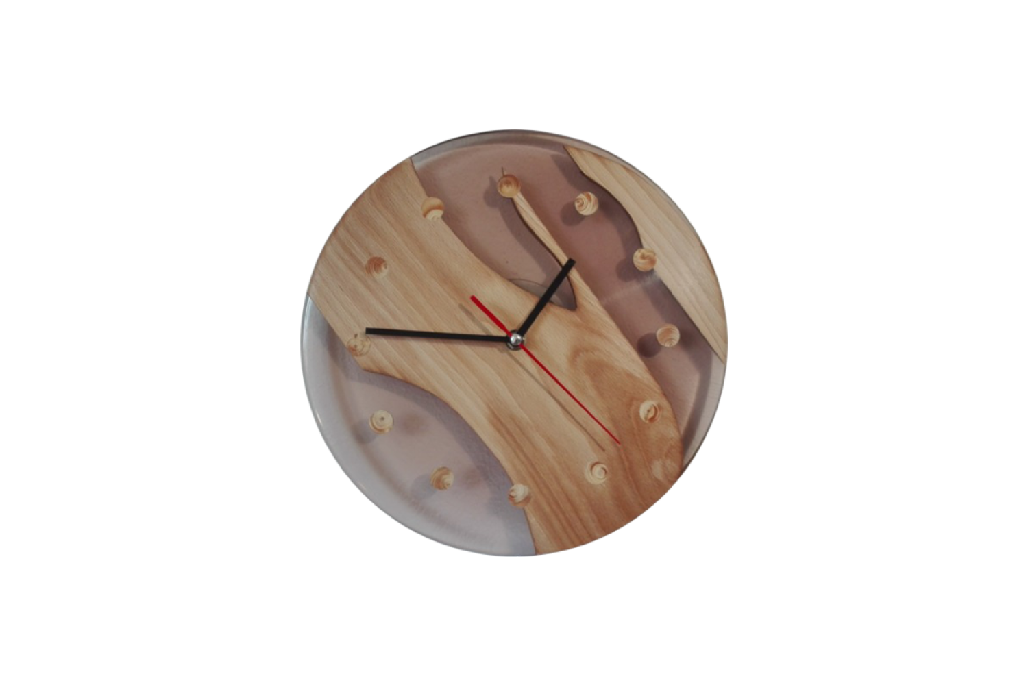 Náš sortiment výrobků s použitím dřeva a pryskyřice jsme rozšířili o výrobu originálních nástěnných dřevěných hodin. Na hodiny používáme různé druhy dřevin, jakou jsou dub, buk, borovice, smrk nebo ořech. K těmto dřevinám volíme různé odstíny pryskyřice. Speciálními pigmenty tónujeme pryskyřici do odstínů červené, modré, zelené, žluté, kouřové či fialové. Do směsi je též možné přidat třpytivé metalické prášky či prášky luminiscenční (svítivé). Dřevěné hodiny jsou osazeny kvalitními strojky Quartz. Vzhledem k tomu, že ciferník nemá čísla, je možné strojkem otočit a zákazník si může sám zvolit v jaké pozici bude dvanáctka. Každé z vyrobených dřevěných hodin jsou jedinečný originál. Neexistují dva stejné kusy. Kompozice dřeva pryskyřice a barevného provedení je též vždy jedinečná a originální. Na přání zákazníka a po osobní konzultaci zalijeme do pryskyřice různé motivy od fotografií přes různé grafické motivy až po firemní loga, takže naše hodiny plní funkci praktickou, funkci originálního designového prvku v domácnosti nebo skvělého dárku či prezentaci firmy.