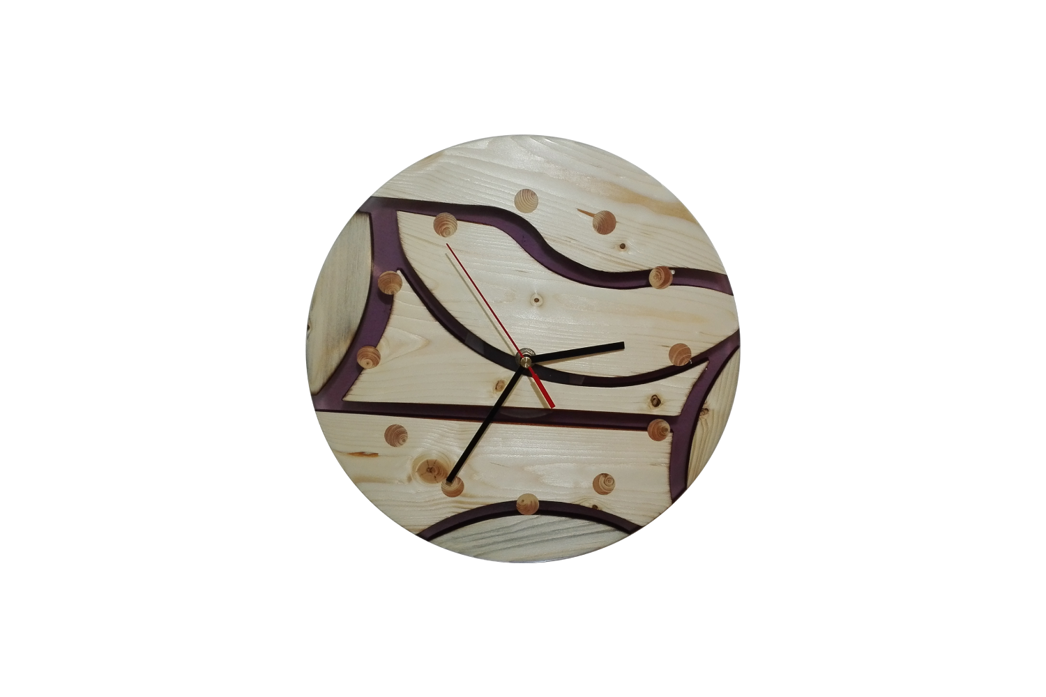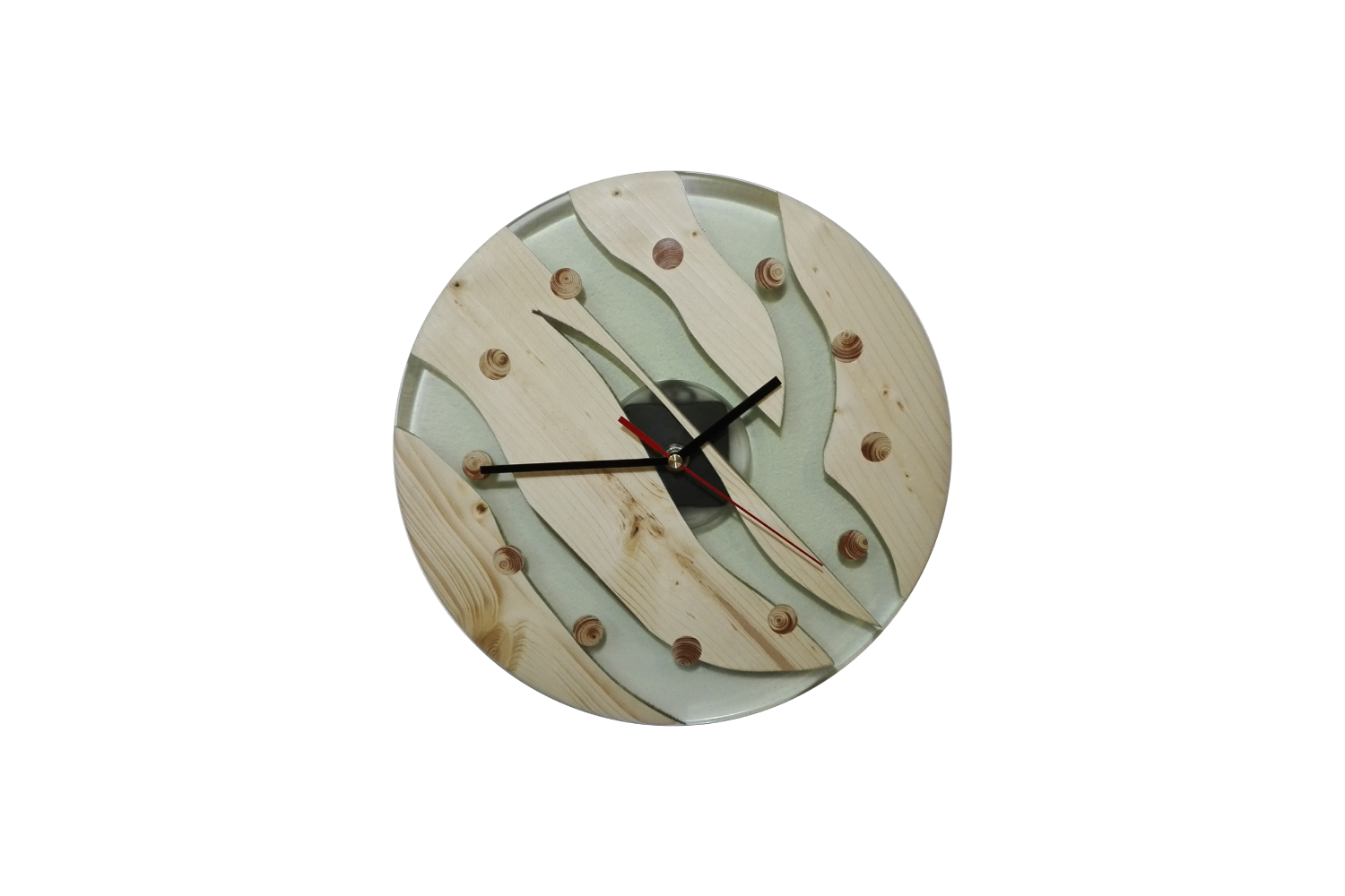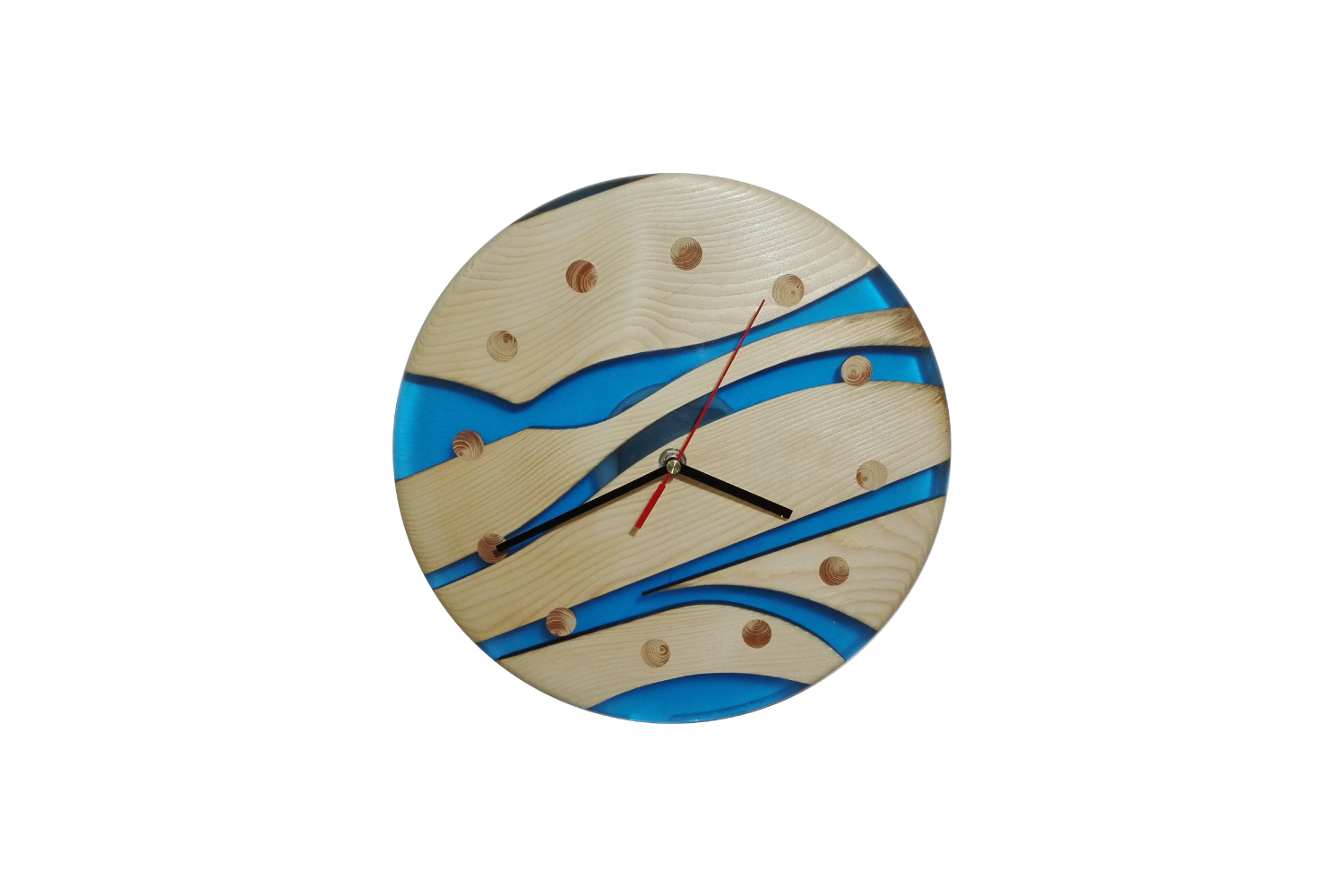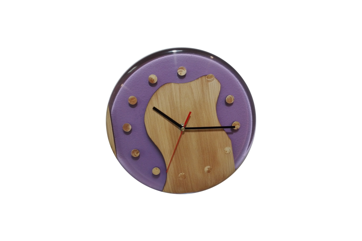 Náš sortiment výrobků s použitím dřeva a pryskyřice jsme rozšířili o výrobu originálních nástěnných dřevěných hodin. Na hodiny používáme různé druhy dřevin, jakou jsou dub, buk, borovice, smrk nebo ořech. K těmto dřevinám volíme různé odstíny pryskyřice. Speciálními pigmenty tónujeme pryskyřici do odstínů červené, modré, zelené, žluté, kouřové či fialové. Do směsi je též možné přidat třpytivé metalické prášky či prášky luminiscenční (svítivé). Dřevěné hodiny jsou osazeny kvalitními strojky Quartz. Vzhledem k tomu, že ciferník nemá čísla, je možné strojkem otočit a zákazník si může sám zvolit v jaké pozici bude dvanáctka. Každé z vyrobených dřevěných hodin jsou jedinečný originál. Neexistují dva stejné kusy. Kompozice dřeva pryskyřice a barevného provedení je též vždy jedinečná a originální. Na přání zákazníka a po osobní konzultaci zalijeme do pryskyřice různé motivy od fotografií přes různé grafické motivy až po firemní loga, takže naše hodiny plní funkci praktickou, funkci originálního designového prvku v domácnosti nebo skvělého dárku či prezentaci firmy.